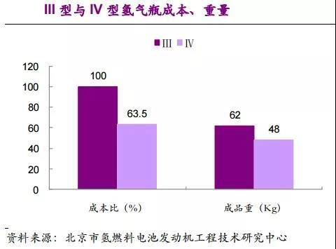 通過相同外徑、容積和壓力(70MPa)的III型與IV型氫氣瓶進(jìn)行比較可以清楚發(fā)現(xiàn),IV型具有低成本、小重容、輕量化的優(yōu)勢。