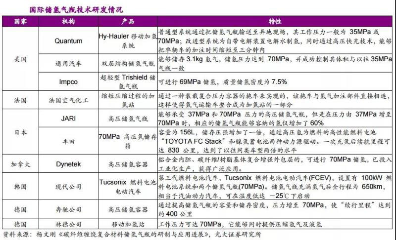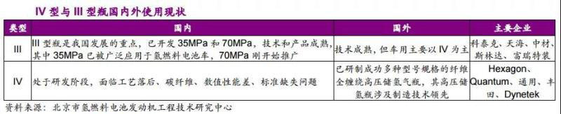 國外乘用車已經(jīng)開始使用質(zhì)量更輕、成本更低、質(zhì)量儲(chǔ)氫密度更高的IV型瓶,而中國IV型瓶還處于研發(fā)階段,成熟產(chǎn)品只有35MPa和70MPaIII型瓶,其中70MPaIII型瓶在乘用車樣車上應(yīng)用。
