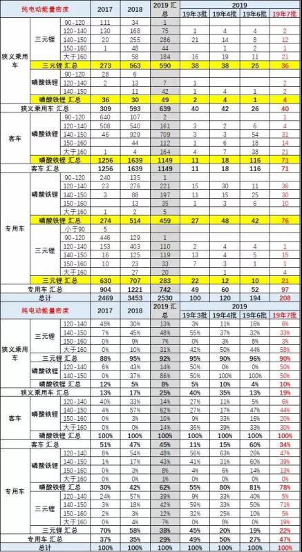 專用車相對于客車和乘用車電池表現(xiàn)稍差,目前磷酸鐵鋰中占據(jù)極高的比例,,成為低端技術(shù)的降級特征。前期的基本都在120-140區(qū)間內(nèi)。2019年1-7批轉(zhuǎn)入140-160能量密度。