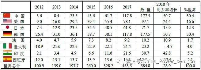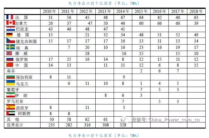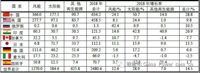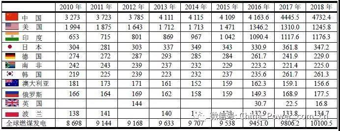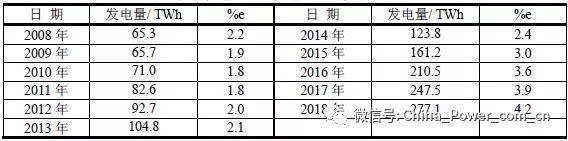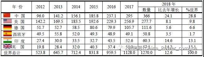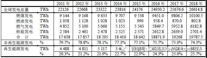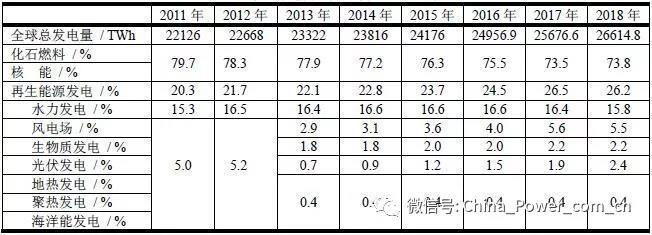 電力可來自非再生能源發(fā)電和再生能源發(fā)電。表中2010~2015年數(shù)據(jù)來自國際能源署(IEA)《Key world energy statistics》報告的數(shù)據(jù),而2016~2018年《BP Statistical Review of World Energy June 2018-2019》的數(shù)據(jù)。