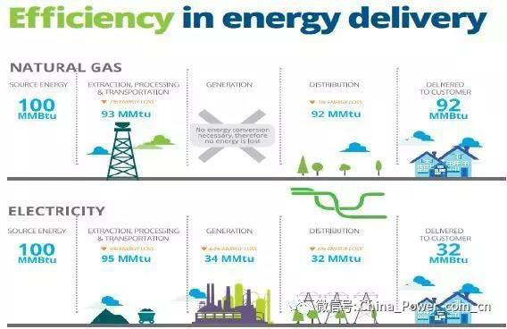 根據(jù)世界氣體協(xié)會(IGU)發(fā)布的《Natural Gas:The Energy for today and future 2017》的報告中,講述能源輸送的損失,100份天然氣到用戶可以獲得92份,而100份電力來源,輸送到用戶,只能獲得32份。