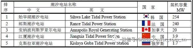世界上最大的潮汐電站是韓國始華湖潮汐電站(Sihwa Lake Tidal Power Station),裝機容量為254MW。中國最大的潮汐電站是江廈潮汐電站(Jiangxia Tidal Power Station ),裝機容量僅為3.9MW。
