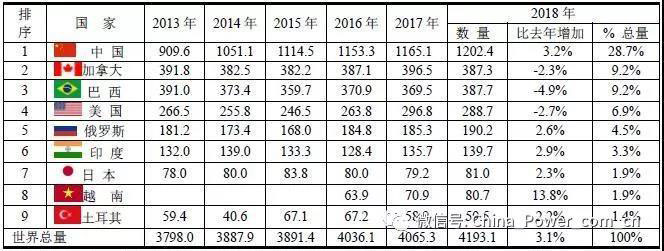 根據(jù)BP 2019的報告,中國水力發(fā)電量居世界之首,2018年占全球水力發(fā)電量的1202.4/4193.1=28.7%;其次為加拿大、巴西。發(fā)展最快的要算越南,比去年增加13%。