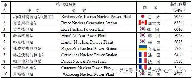 世界上最大的核電站是日本柏崎刈羽核電站,裝機容量為7965MW,但2011年已經(jīng)停工。值得注意的是韓國核電站進展很快,前十位核電站就占有4席,把美國和日本都摔到后面。