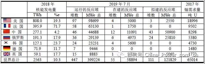 表中“%e”表示核能發(fā)電占發(fā)電總量的百分率。全球核能發(fā)電占全球發(fā)電總量的10.3%,其中法國高達71.7%。