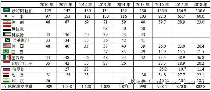 燃油發(fā)電在化石燃料發(fā)電份額中不占重要地位,而且逐步在降低。2018年僅占全球發(fā)電總量的802.8/26614.8=3.0%,比去年870.0/25676.6=3.4%減少了0.4%。燃油發(fā)電最多的國家是沙特阿拉伯,占燃油發(fā)電總量的150.6/802.8= 18.6%,其次是日本,占60.0/802.8= 7.5%。