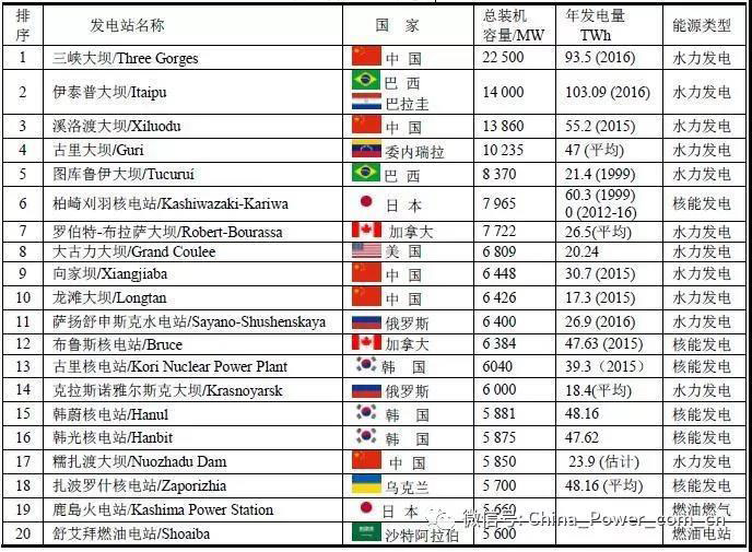 在世界上前20位發(fā)電站中,中國水力發(fā)電占有5席,均為水力發(fā)電。水力發(fā)電和核能發(fā)電均屬清潔能源發(fā)電,獨霸前20強,化石燃料發(fā)電的地位逐步降低。