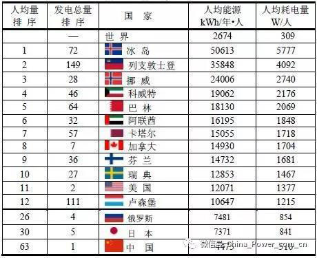 人均能源消費量和人均耗電量在一定程度上反映一個國家或地區(qū)經(jīng)濟發(fā)展水平和人民生活水平。根據(jù)美國中央情報局2016年的數(shù)據(jù),人均能源消費量和人均耗電量最多的國家是冰島和列支敦士登。雖然中國電力產(chǎn)量居世界首位,但人均能源消耗量居世界第63位。