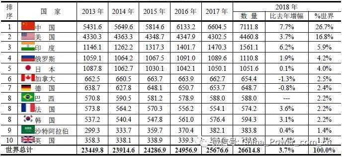 2013~2018年主要國家的電力生產(chǎn)量(單位:TWh)