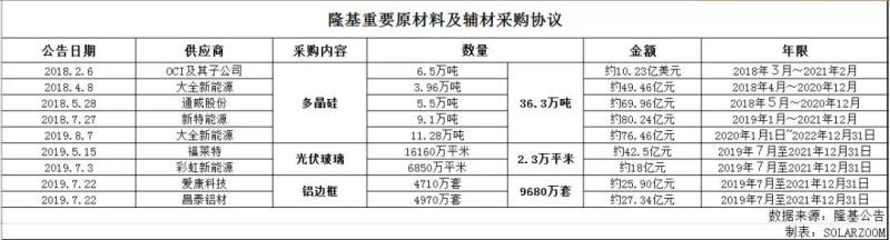 SOLARZOOM還整理了2018年至今隆基簽署的光伏產(chǎn)品原材料及重要輔材采購清單,由下表可見,到2022年,隆基多晶硅采購將至少36.3萬噸。