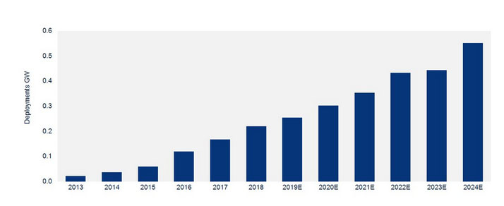 歐洲累計部署的住宅儲能容量預(yù)計將增長五倍,到2024年將達(dá)到6.6GWh。到2024年,該地區(qū)的年度部署量將增加一倍以上,每年將部署500MW/1.2GWh。