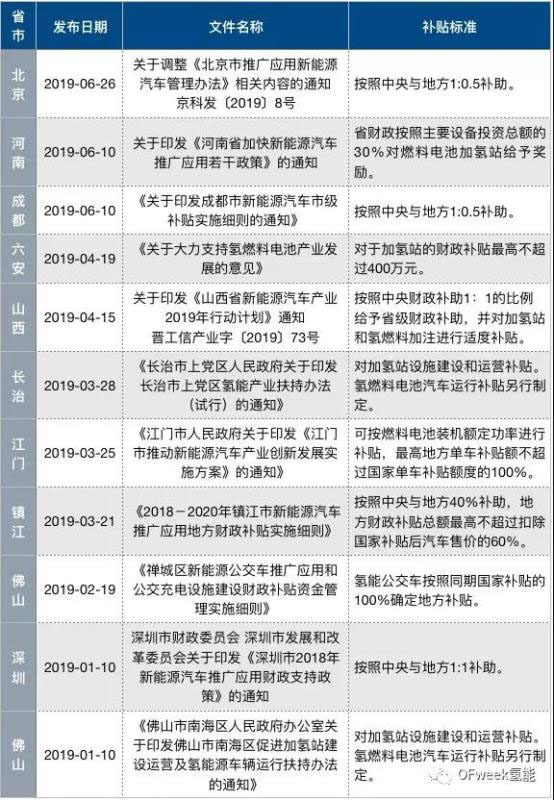 2019年3月26日,四部委發(fā)布《關(guān)于進(jìn)一步完善新能源汽車(chē)推廣應(yīng)用財(cái)政補(bǔ)貼政策的通知》,通知從2019年3月26日起實(shí)施,2019年3月26日至2019年6月25日為過(guò)渡期。過(guò)渡期期間銷(xiāo)售上牌的燃料電池汽車(chē)按2018年對(duì)應(yīng)標(biāo)準(zhǔn)的0.8倍補(bǔ)貼。目前過(guò)渡期已過(guò),之后的燃料電池補(bǔ)貼政策尚未發(fā)布。OFweek氫能匯總了2019年上半年國(guó)內(nèi)的主要燃料電池和加氫站的補(bǔ)貼政策。