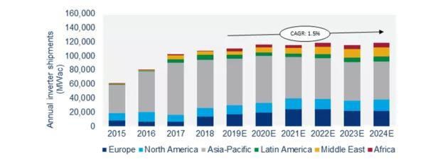 該報告稱,盡管全球光伏逆變器出貨量在持續(xù)增加,但市場價值將到2024年間持續(xù)下降。一部分來自中國531新政的原因,使得價格壓力在2018年加劇。降低上網(wǎng)電價,并終止對新建大型大面電站的補貼,531新政對中國市場造成了巨大的沖擊,同時,中國供應(yīng)商開始更積極地進(jìn)軍國際市場,從而加劇了逆變器市場的價格壓力。