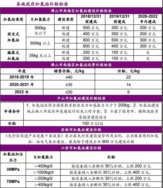 2018年4月12日,《佛山市南海區(qū)促進加氫站建設(shè)運營及氫能源車輛運行扶持辦法(暫行)》出臺,對南海區(qū)加氫站建設(shè)及運營進行補貼,扶持辦法中對新建的固定式加氫站最高補貼金額達800萬元,是目前加氫站扶持政策中最高的,且當?shù)仄髽I(yè)不僅可享受南海區(qū)的補貼政策,還可以同時享受上級相關(guān)補貼政策。