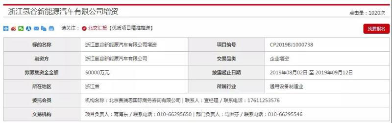 8月13日,北京產(chǎn)權(quán)交易所網(wǎng)站消息顯示,浙江氫谷新能源汽車有限公司(下稱“浙江氫谷”)增資項目在北京產(chǎn)權(quán)交易所正式掛牌。該項目擬募集資金5億元,擬征集投資方1至2個,新進股東合計持股比例不高于10%,所募集資金將主要用于氫燃料電池生產(chǎn)線設備、研發(fā)費用、訂單完成所需流動資金。
