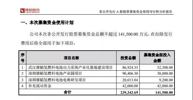 據(jù)公告顯示,在扣除發(fā)行費(fèi)用后將全部用于以下4個(gè)方面:(1)武漢雄韜氫燃料電池動(dòng)力系統(tǒng)產(chǎn)業(yè)化基地建設(shè)項(xiàng)目;(2)深圳雄韜氫燃料電池產(chǎn)業(yè)園項(xiàng)目;(3)深圳雄韜氫燃料電池電堆研發(fā)項(xiàng)目;(4)補(bǔ)充流動(dòng)資金。