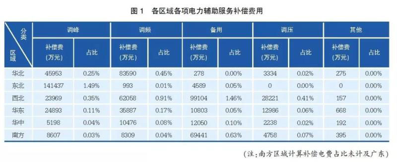 從2018年上半年電力輔助服務的數(shù)據(jù)看:東北、西北區(qū)域調(diào)峰補償力度最大,西北、華北區(qū)域調(diào)頻(西北區(qū)域調(diào)頻為AGC加一次調(diào)頻,其他區(qū)域調(diào)頻為AGC)補償力度最大,西北、南方區(qū)域備用補償力度最大(如圖1所示)。