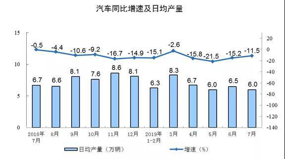分產(chǎn)品看, 19年7月份汽車生產(chǎn)的日均汽車生產(chǎn)6.0萬臺,增長-12%??紤]到18年7月的6.7萬的較低增速,今年增速-15%的表現(xiàn)相對很差。