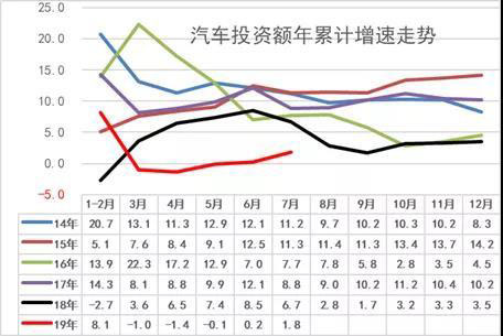 1-7月汽車投資應(yīng)該是不強,但7月大幅改善。從1-6月的0.2%上升到19年1-7月的1.8%,上升幅度較大。6-7月走出負增長區(qū)間,體現(xiàn)行業(yè)的巨大拉升投資熱情。
