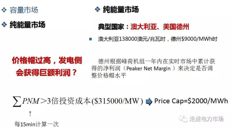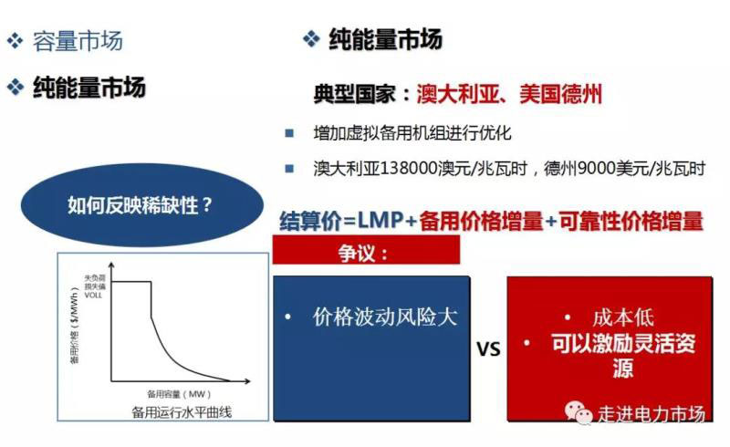 這個方式其實我們國家不太能接受,認為價格波動風險大。但是支持他們的觀點認為,它第一個成本低,只是需要讓市場去引導,不需要額外再組織一個市場。德州在討論發(fā)電容量充裕性問題的時候,也認為再組織一個容量市場沒必要,會增加成本,最終決定提高價格帽,并引入了備用價格增量。