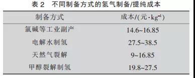 再?gòu)臍錃獾某杀境霭l(fā)進(jìn)行分析。目前氫氣加注到車的成本主要分為三部分:一是制備/提純成本,二是運(yùn)輸成本,三是站內(nèi)成本。不同制備方式的制備/提純成本如表2所示。