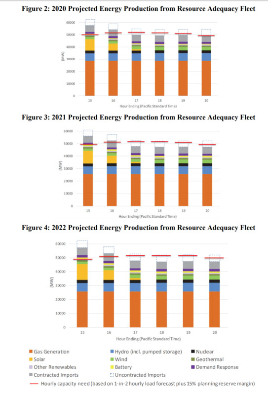 在2020年,在下午17點到19點峰值需求結(jié)束的時間內(nèi),資源充足性支持的裝機容量短缺分別為2,200MW、2,300 MW、1,500MW。在2021年,在下午17點到19點峰值需求結(jié)束的時間內(nèi),容量短缺分別提高到4,000MW、4,400MW、3,800MW、2,200MW。而在2022年下午17點到19點峰值需求結(jié)束的時間內(nèi),容量短缺分別為3,900MW、4,700MW、4,200MW、2,600 MW。
