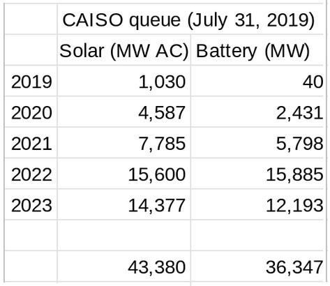 加利福尼亞獨立系統(tǒng)運營商(CAISO)的未來容量中(下圖)包括裝機容量為43GW的太陽能發(fā)電設(shè)施和裝機容量為36GW儲能系統(tǒng)。但是,大部分是都是獨立安裝和部署。而且,大多數(shù)項目沒有提交建設(shè)計劃。
