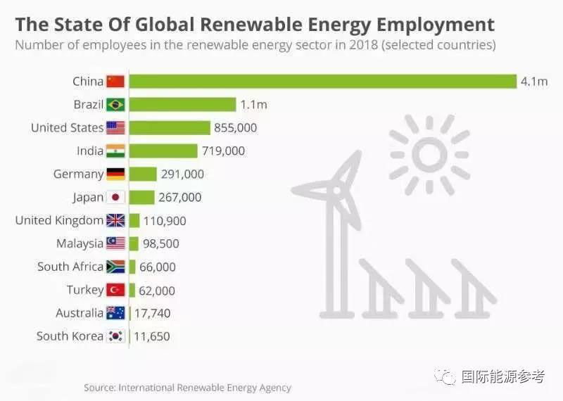 IRENA的報告指出,中國無疑是全球可再生能源就業(yè)市場的領(lǐng)導(dǎo)者,去年從業(yè)人數(shù)達到410萬,占全球就業(yè)人數(shù)總量的39%。