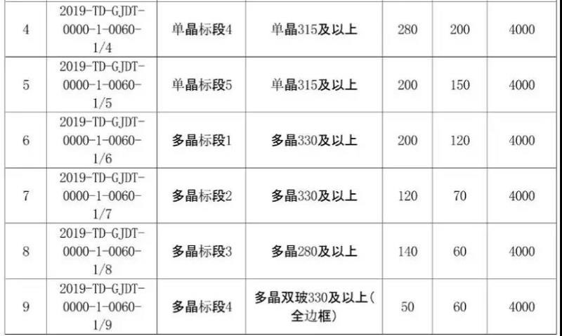 根據(jù)招標(biāo)公告,本次投標(biāo)人如對多晶標(biāo)段1、2、3進(jìn)行投標(biāo),必須對這3個(gè)標(biāo)段全部進(jìn)行投標(biāo),多晶標(biāo)段1、2所投組件應(yīng)為統(tǒng)一規(guī)格(功率);如對單晶標(biāo)段3、4、5進(jìn)行投標(biāo),必須對這3個(gè)標(biāo)段全部進(jìn)行投標(biāo),所投組件應(yīng)為統(tǒng)一規(guī)格(功率)。各標(biāo)段招標(biāo)規(guī)格及容量如下表: