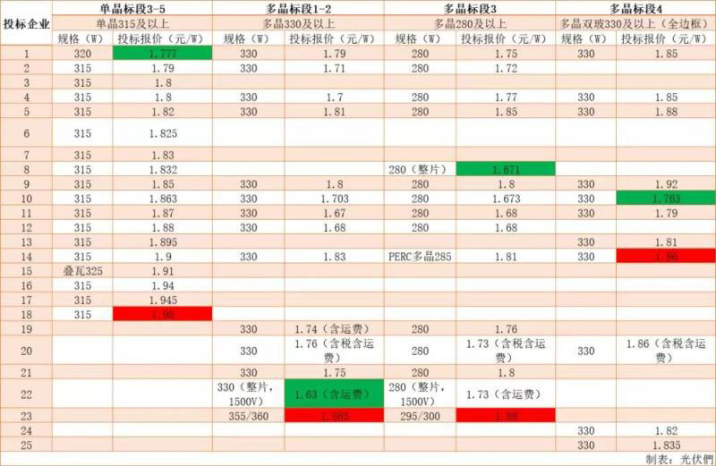 多晶方面,多晶標(biāo)段1-2規(guī)格為330W及以上,多晶標(biāo)段3規(guī)格為280W及以上,共計(jì)15家企業(yè)參與投標(biāo);多晶標(biāo)段4規(guī)格為全邊框雙玻330W及以上多晶組件,共11家企業(yè)參與投標(biāo)。