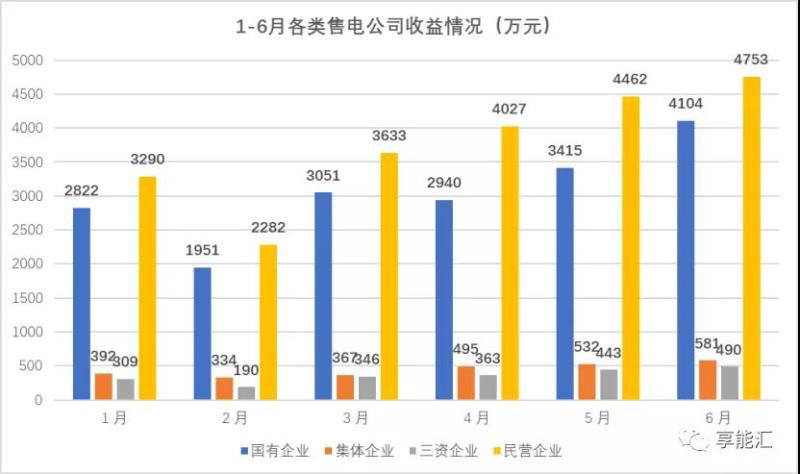 1-6月,電力用戶實際結算收益分成為86.9%,各月分成均在85%以上。上半年共有10家售電公司收益為負,整體虧損面為 7.8%,各類售電公司之間收益差異明顯。