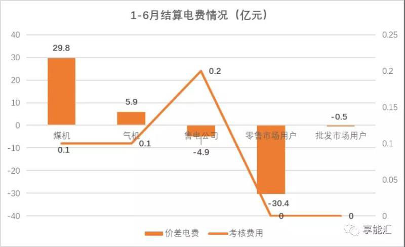 1-6月,供給側結算讓利35.9億元(其中價差電費35.7億元,考核費用0.1億元),按結算市場電量算平均價差-40.6厘/千瓦時,用戶(含批發(fā)市場用戶和零售市場用戶)凈收益30.8億元,按結算市場電量算平均價差-35.0厘/千瓦時,售電公司凈收益4.7億元(其中價差電費4.9億元,考核費用0.2億元),按結算市場電量算平均價差 -5.3厘/千瓦時。