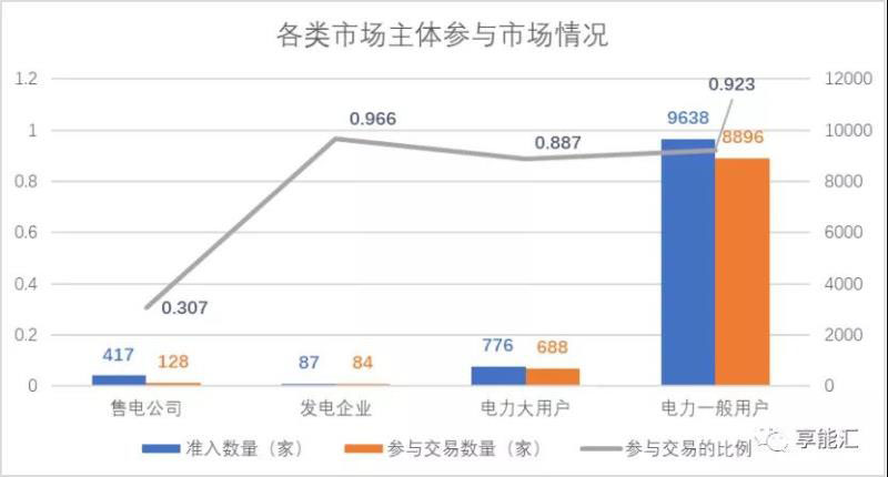 截至6月底,獲準進入市場的主體中,參與市場交易的9796家,占總數(shù)的89.7%。其中,售電公司有128家參與市場交易,占準入售電公司總數(shù)的30.7%;發(fā)電企業(yè)、電力用戶(含直接參與交易和售電公司代理交易)參與交易的比例都在90%以上。