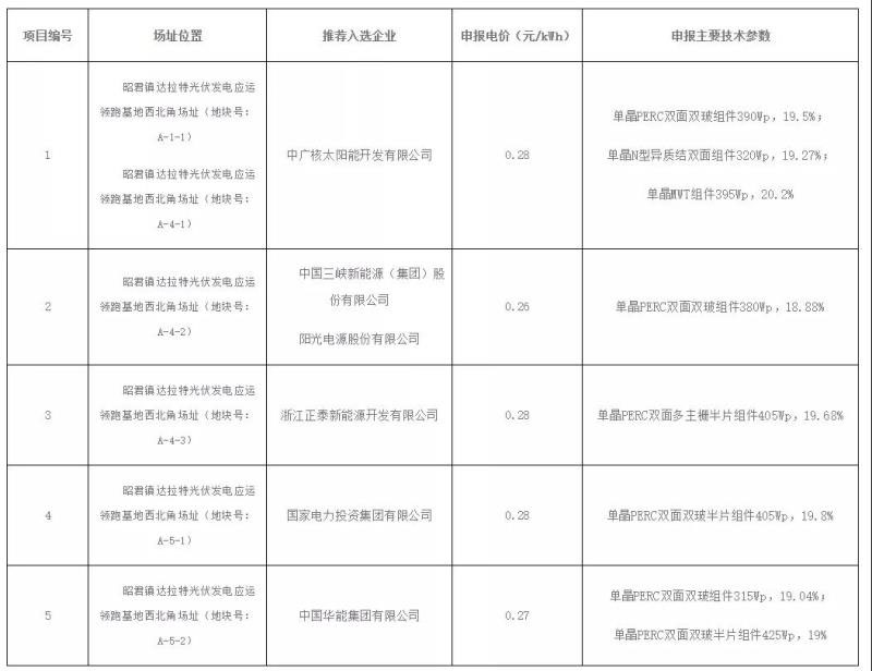 8月26日,內(nèi)蒙古達(dá)拉特旗光伏領(lǐng)跑者獎(jiǎng)勵(lì)規(guī)模公布中標(biāo)企業(yè),中廣核、三峽+陽光電源、正泰、國家電投、華能入圍,最低中標(biāo)電價(jià)0.26元/千瓦時(shí)。