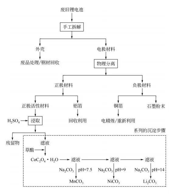 濕法冶金是先拆解電池外殼,破碎、篩分后獲取電極材料,電極材料中的有價金屬在酸或生物溶液中浸取,再進行分離,獲得各金屬相應的鹽或氧化物。