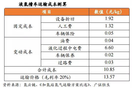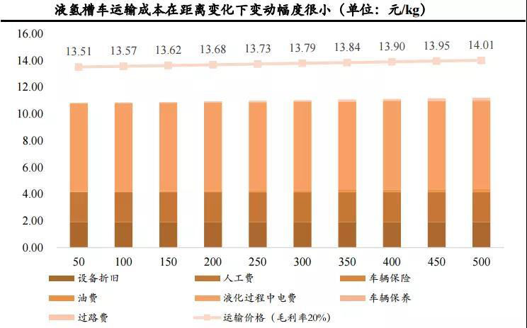 而與距離呈正相關(guān)的油費(fèi)、路費(fèi)等占比并不大,液氫罐車在長距離運(yùn)輸下更具成本優(yōu)勢(shì)。