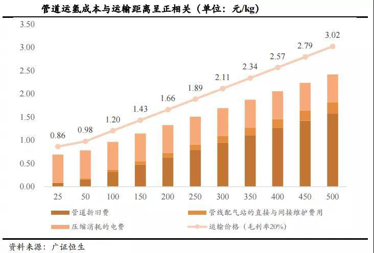 由于壓縮每公斤氫氣所消耗的電量是一定的,管道運(yùn)氫成本增長的驅(qū)動(dòng)因素主要是與輸送距離正相關(guān)的管材折舊及維護(hù)費(fèi)用。