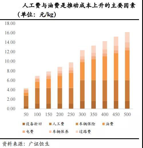 每增加一臺(tái)拖車,折舊費(fèi)與人工費(fèi)會(huì)有明顯提升。除此之外,油費(fèi)也會(huì)隨距離增加顯著上升,占比由20%上升至40%,是推動(dòng)成本上升的第二大因素。