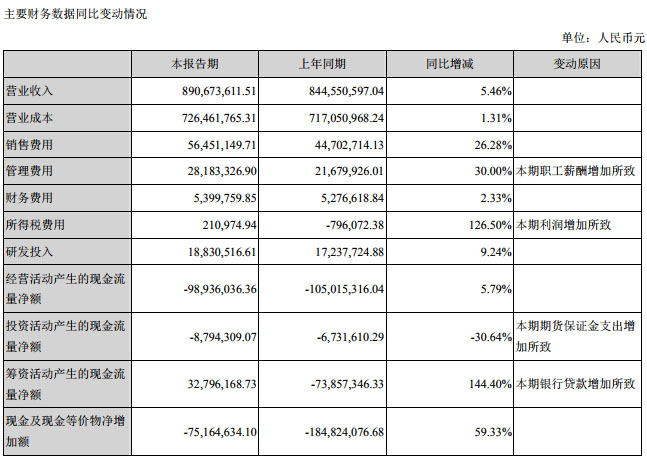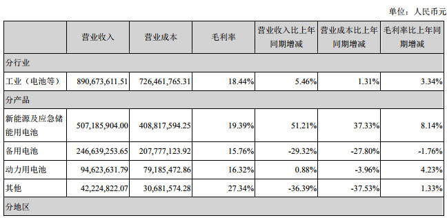其中營業(yè)收入構成顯示,新能源及應急儲能電池營業(yè)收入5.07億元,占營業(yè)收入比重56.94%,較上年同期增長51.21%,毛利率19.39%,較上年同期增長8.14%。備用電池營業(yè)收入占比27.69%,動力電池占比10.62%。