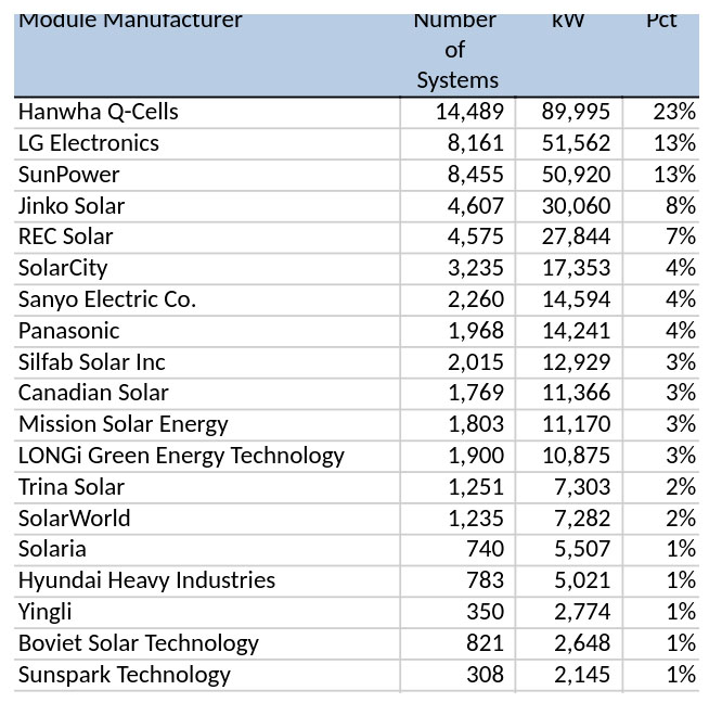 為了了解發(fā)展趨勢(shì),需要了解全球太陽能發(fā)電模塊和逆變器制造商的表現(xiàn)。Hanwha公司在住宅太陽能發(fā)電模塊市場中占據(jù)了23%的市場份額(如下圖所示),緊隨其后的是LG公司和Sunpower公司,這三家公司的市場份額之和達(dá)到市場總額的49%。該報(bào)告對(duì)107家太陽能組件廠商進(jìn)行調(diào)查統(tǒng)計(jì)。