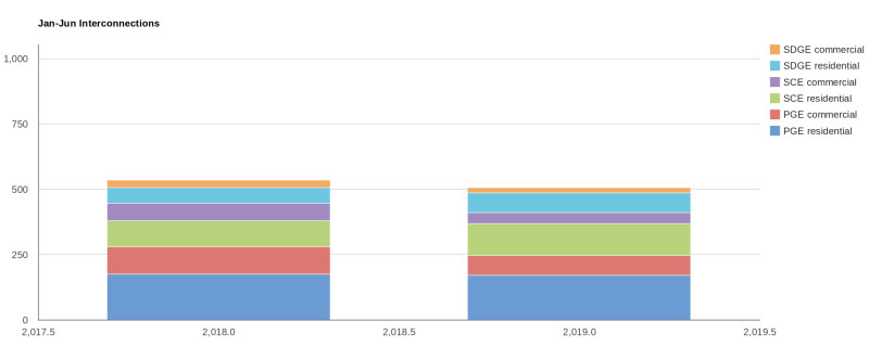 調(diào)查數(shù)據(jù)表明,加利福尼亞州三個(gè)主要公用事業(yè)公司——圣地亞哥天然氣和電力公司、南加州愛迪生公司和太平洋天然氣和電力公司2019年住宅儲(chǔ)能系統(tǒng)的部署顯著增長(如下圖所示),商業(yè)儲(chǔ)能部署有所下降。