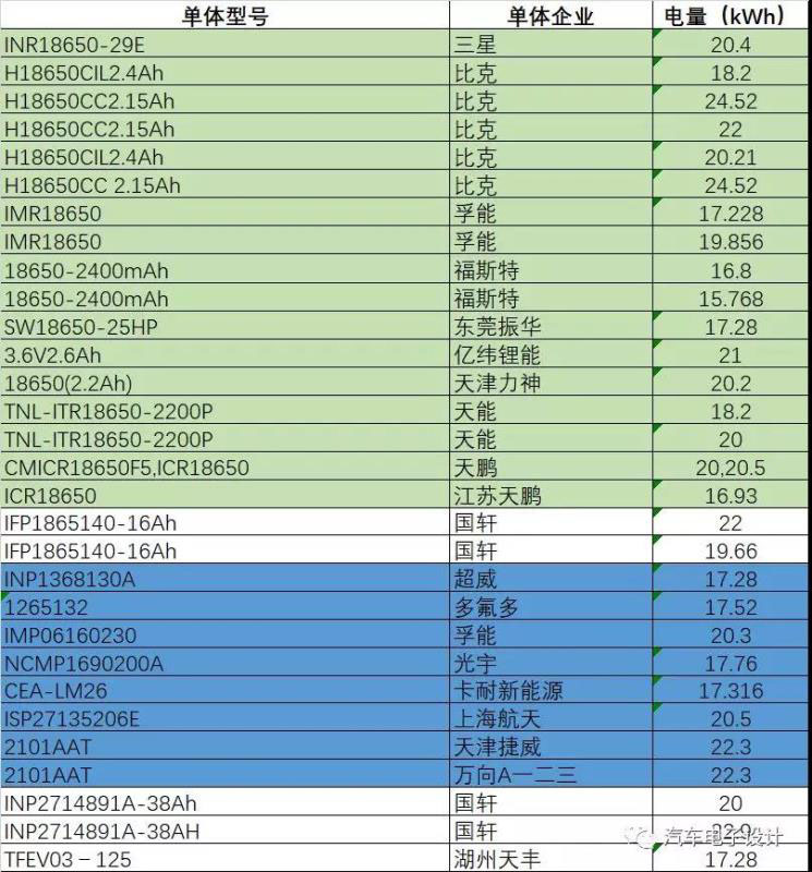 我們從2017年開始,2017年5月份的電芯情況如下圖所示,主要是18650和軟包為主的,由于A00級別的電動汽車當時普遍只有150km,帶電量從15kWh-20kwh左右,所以整體的配置情況是小電芯做小電池。