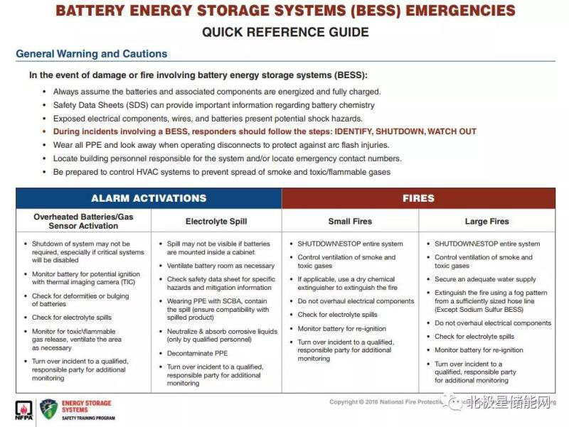 應(yīng)急準(zhǔn)備是儲(chǔ)能系統(tǒng)安裝規(guī)劃的重要組成部分。在儲(chǔ)能系統(tǒng)投入使用之前,還需要制定應(yīng)急操作策略相關(guān)培訓(xùn)。設(shè)備管理人員必須每年接受培訓(xùn)。負(fù)責(zé)人還需要與當(dāng)?shù)叵啦块T進(jìn)行協(xié)調(diào),以便第一應(yīng)答人員了解在特定位置的儲(chǔ)能系統(tǒng)可能存在的危害,以便迅速作出相應(yīng)的回應(yīng)。今年早些時(shí)候,美國國家消防協(xié)會(huì)為第一應(yīng)答人員更新了其免費(fèi)的在線自制培訓(xùn)。這種服務(wù)是向當(dāng)?shù)叵廊藛T提供儲(chǔ)能系統(tǒng)專業(yè)術(shù)語、危險(xiǎn)和應(yīng)對(duì)策略方面培訓(xùn)。NFPA 855標(biāo)準(zhǔn)還包括一份關(guān)于消防操作注意事項(xiàng)的附件,該附件對(duì)第一應(yīng)答人員來說非常有用。