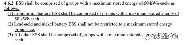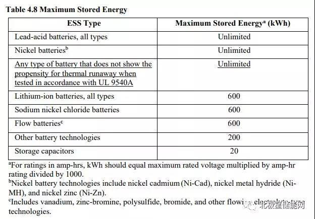 NFPA 855還制定了每種儲(chǔ)能技術(shù)的最大儲(chǔ)能閾值。例如,對(duì)于所有種類的鋰離子電池、液流電池等儲(chǔ)能系統(tǒng)來說存儲(chǔ)能量上限是600 kWh,而所有鉛酸電池都沒有設(shè)定上限。