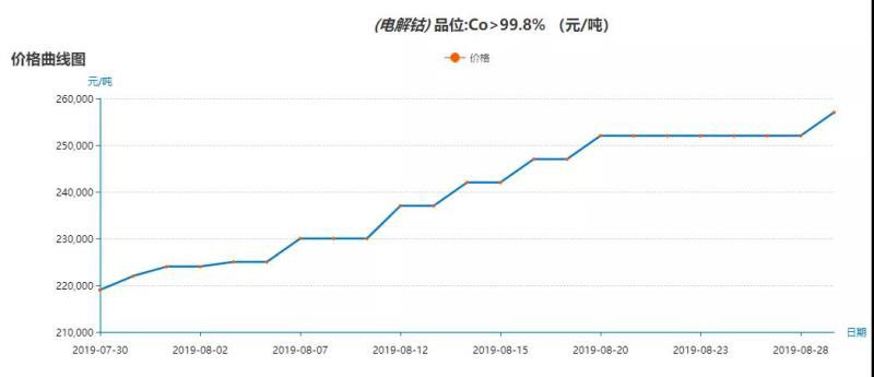 本月初,嘉能可宣布將于2021年以前暫停旗下位于剛果(金)的Mutanda礦生產(chǎn)。據(jù)了解,2018年Mutanda礦產(chǎn)鈷2.73萬噸,占全球供應(yīng)鏈的20.8%,是當(dāng)前全球最大的鈷礦。Mutanda停產(chǎn)的消息極大地刺激了全球“鈷”市,萎靡多時(shí)的鈷價(jià)立即大幅反彈。截至8月29日,電解鈷的價(jià)格已經(jīng)達(dá)到257000元/噸,較8月6日Mutanda透露停產(chǎn)消息之前的價(jià)格225000元/噸,有了大幅上漲。同時(shí),也間接帶動(dòng)了如贛鋒鋰業(yè)、盛屯礦業(yè)等在鈷礦上有所布局的動(dòng)力電池產(chǎn)業(yè)鏈企業(yè)股市上揚(yáng)。