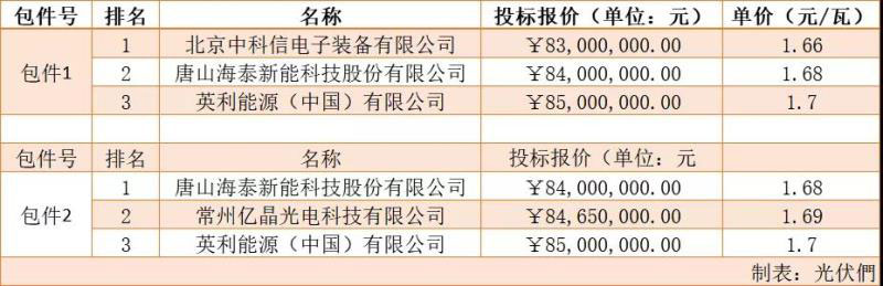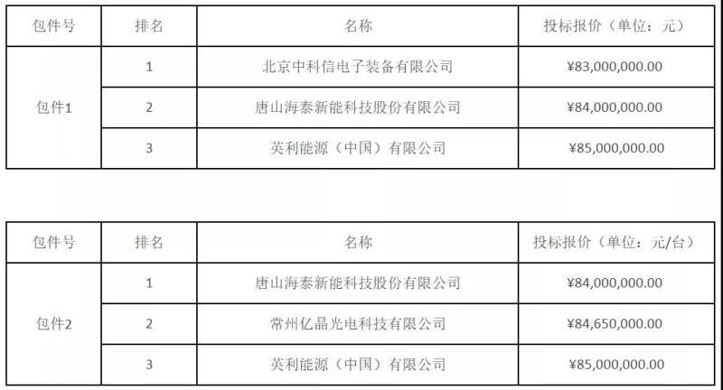其中,北京中科信電子裝備、唐山海泰分別位列組件兩個標段第一中標候選人。從招標要求看,組件要求為多晶275/280/330Wp,即為常規(guī)多晶組件;從報價上看,最低價格為1.66元/瓦。在集中式逆變升壓一體機招標中,深圳科士達為該標段第一中標候選人,最低價格為0.186元/瓦。