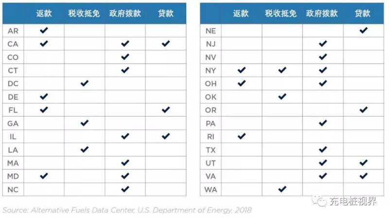 許多州提供安裝電動汽車充電設(shè)備的激勵措施。包括退稅、稅收抵免、免稅、補助和貸款(下表)。
