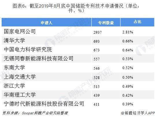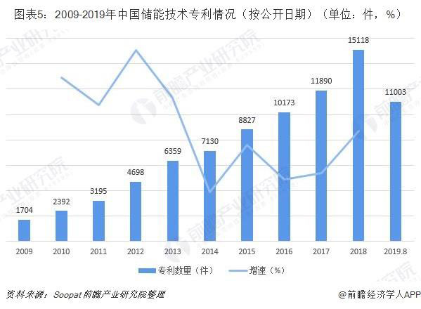 以“儲(chǔ)能”為關(guān)鍵詞在“SooPAT專(zhuān)利信息搜索引擎進(jìn)行檢索,2009-2018年,中國(guó)儲(chǔ)能技術(shù)專(zhuān)利量呈快速上升的趨勢(shì),其年復(fù)合增長(zhǎng)率達(dá)36.59%。2019年1-8月,中國(guó)儲(chǔ)能技術(shù)專(zhuān)利數(shù)量新增11003件,整體來(lái)看,我國(guó)儲(chǔ)能電站產(chǎn)業(yè)技術(shù)活躍度較高。