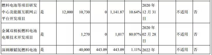 公司還在半年報(bào)中透露了募集資金總體使用情況,目前雄韜股份募集資金總額達(dá)13.2億元,已累計(jì)投入募集資金總額4.44億元,其中有三個(gè)項(xiàng)目涉及燃料電池。