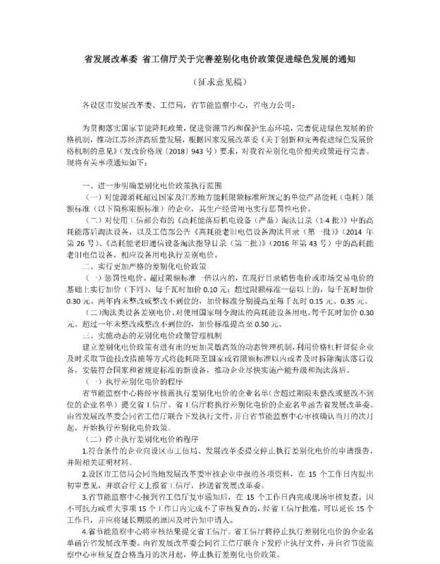 近日,江蘇省發(fā)展改革委、工信廳聯(lián)合發(fā)布《關(guān)于完善差別化電價(jià)政策促進(jìn)綠色發(fā)展的通知(征求意見稿)》(以下簡稱《意見稿》),對(duì)能源消耗超過國家及江蘇地方能耗限額標(biāo)準(zhǔn)所規(guī)定的單位產(chǎn)品能耗(電耗)限額標(biāo)準(zhǔn)的企業(yè),實(shí)行生產(chǎn)經(jīng)營用電懲罰性電價(jià)。